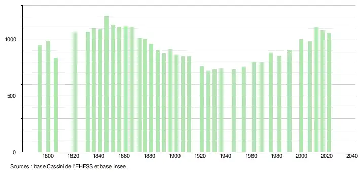 L'évolution du nombre d'habitants est connue à travers les recensements de la population effectués dans la commune depuis 1793. Pour les communes de moins de 10 000 habitants, une enquête de recensement portant sur toute la population est réalisée tous les cinq ans, les populations légales des années intermédiaires étant quant à elles estimées par interpolation ou extrapolation[29]. Pour la commune, le premier recensement exhaustif entrant dans le cadre du nouveau dispositif a été réalisé en 2006[30].
