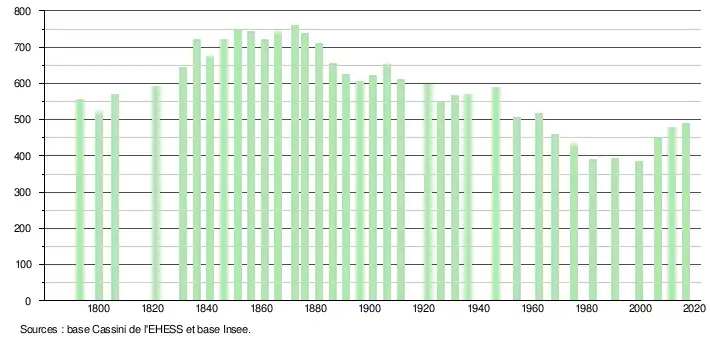 L'évolution du nombre d'habitants est connue à travers les recensements de la population effectués dans la commune depuis 1793. Pour les communes de moins de 10 000 habitants, une enquête de recensement portant sur toute la population est réalisée tous les cinq ans, les populations légales des années intermédiaires étant quant à elles estimées par interpolation ou extrapolation[4]. Pour la commune, le premier recensement exhaustif entrant dans le cadre du nouveau dispositif a été réalisé en 2006[5].