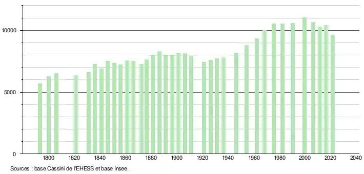 - Par convention dans Wikipédia, le principe a été retenu de n’afficher dans le tableau des recensements et le graphique, pour les populations légales postérieures à 1999, que les populations correspondant à une enquête exhaustive de recensement pour les communes de moins de 10 000 habitants, et que les populations des années 2006, 2011, 2016, etc. pour les communes de plus de 10 000 habitants, ainsi que la dernière population légale publiée par l’Insee pour l'ensemble des communes.