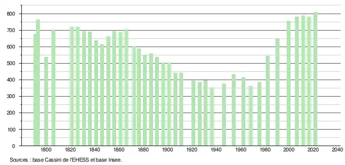 L'évolution du nombre d'habitants est connue à travers les recensements de la population effectués dans la commune depuis 1791. Pour les communes de moins de 10 000 habitants, une enquête de recensement portant sur toute la population est réalisée tous les cinq ans, les populations légales des années intermédiaires étant quant à elles estimées par interpolation ou extrapolation[22]. Pour la commune, le premier recensement exhaustif entrant dans le cadre du nouveau dispositif a été réalisé en 2006[23].