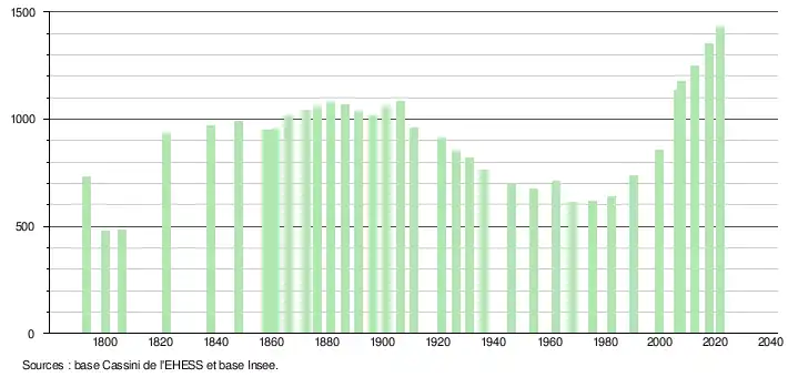 L'évolution du nombre d'habitants est connue à travers les recensements de la population effectués dans la commune depuis 1793. Pour les communes de moins de 10 000 habitants, une enquête de recensement portant sur toute la population est réalisée tous les cinq ans, les populations légales des années intermédiaires étant quant à elles estimées par interpolation ou extrapolation[26]. Pour la commune, le premier recensement exhaustif entrant dans le cadre du nouveau dispositif a été réalisé en 2007[27].
