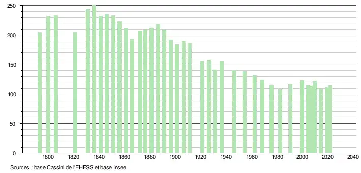 L'évolution du nombre d'habitants est connue à travers les recensements de la population effectués dans la commune depuis 1793. Pour les communes de moins de 10 000 habitants, une enquête de recensement portant sur toute la population est réalisée tous les cinq ans, les populations légales des années intermédiaires étant quant à elles estimées par interpolation ou extrapolation[15]. Pour la commune, le premier recensement exhaustif entrant dans le cadre du nouveau dispositif a été réalisé en 2004[16].
