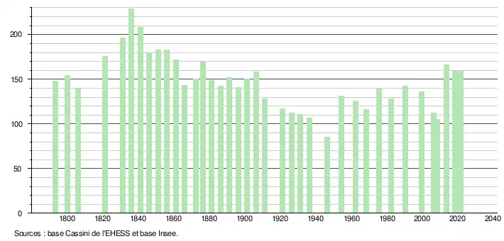 L'évolution du nombre d'habitants est connue à travers les recensements de la population effectués dans la commune depuis 1793. Pour les communes de moins de 10 000 habitants, une enquête de recensement portant sur toute la population est réalisée tous les cinq ans, les populations légales des années intermédiaires étant quant à elles estimées par interpolation ou extrapolation[55]. Pour la commune, le premier recensement exhaustif entrant dans le cadre du nouveau dispositif a été réalisé en 2008[56].