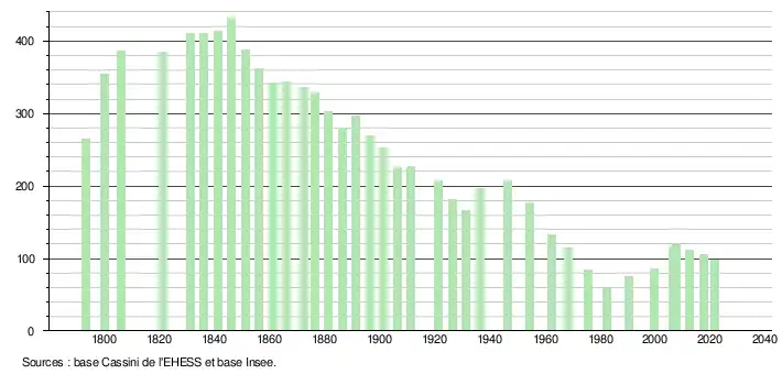 L'évolution du nombre d'habitants est connue à travers les recensements de la population effectués dans la commune depuis 1793. Pour les communes de moins de 10 000 habitants, une enquête de recensement portant sur toute la population est réalisée tous les cinq ans, les populations légales des années intermédiaires étant quant à elles estimées par interpolation ou extrapolation[21]. Pour la commune, le premier recensement exhaustif entrant dans le cadre du nouveau dispositif a été réalisé en 2007[22].