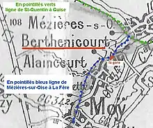 ![]() Tracé de la ligne sur le terroir de Berthenicourt: elle passait au nord-ouest de la commune. La gare était située au bout de la Grande-Rue. | ![]() L'ancienne gare de Berthenicourt devenue une habitation. | ![]() Tracé de l'ancienne voie ferrée et la gare. |