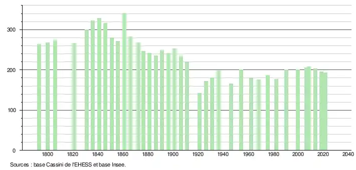L'évolution du nombre d'habitants est connue à travers les recensements de la population effectués dans la commune depuis 1793. Pour les communes de moins de 10 000 habitants, une enquête de recensement portant sur toute la population est réalisée tous les cinq ans, les populations légales des années intermédiaires étant quant à elles estimées par interpolation ou extrapolation[19]. Pour la commune, le premier recensement exhaustif entrant dans le cadre du nouveau dispositif a été réalisé en 2008[20].