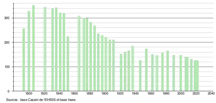 L'évolution du nombre d'habitants est connue à travers les recensements de la population effectués dans la commune depuis 1793. Pour les communes de moins de 10 000 habitants, une enquête de recensement portant sur toute la population est réalisée tous les cinq ans, les populations légales des années intermédiaires étant quant à elles estimées par interpolation ou extrapolation[18]. Pour la commune, le premier recensement exhaustif entrant dans le cadre du nouveau dispositif a été réalisé en 2008[19].