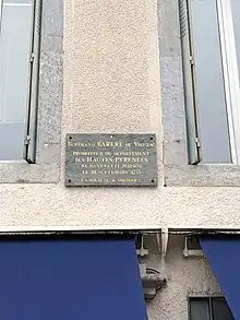 Bertrand Barère est né au n°31 de l'actuelle rue Brauhauban, le 10 septembre 1755 à Tarbes[8], ancienne capitale de la Bigorre, aujourd'hui préfecture du département des Hautes-Pyrénées, dans une famille de la bourgeoisie de robe. Son grand-père Laurens Barère, (1696 - 1750)[9], notaire royal originaire de Bernac-Dessus, épouse en 1726[10] Françoise Carles (1710 - 1748)[10],[11], fille de Bertrand Carles, procureur au sénéchal de Tarbes. Il obtient la charge de son beau-père en 1728[12] et un office notarial en 1735[13]. De son union naissent trois garçons et une fille :