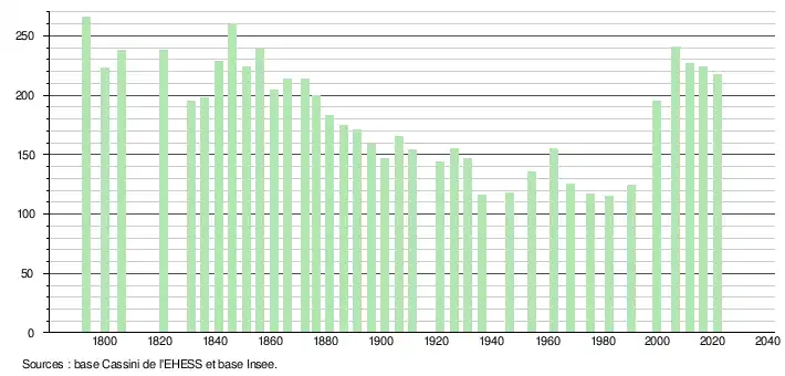 L'évolution du nombre d'habitants est connue à travers les recensements de la population effectués dans la commune depuis 1793. Pour les communes de moins de 10 000 habitants, une enquête de recensement portant sur toute la population est réalisée tous les cinq ans, les populations légales des années intermédiaires étant quant à elles estimées par interpolation ou extrapolation[22]. Pour la commune, le premier recensement exhaustif entrant dans le cadre du nouveau dispositif a été réalisé en 2006[23].