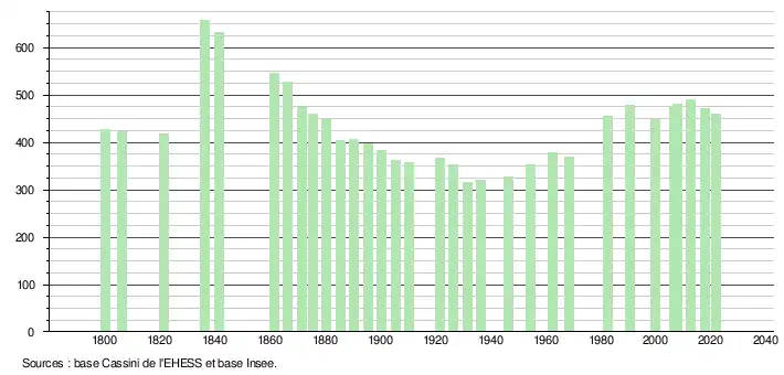 L'évolution du nombre d'habitants est connue à travers les recensements de la population effectués dans la commune depuis 1800. Pour les communes de moins de 10 000 habitants, une enquête de recensement portant sur toute la population est réalisée tous les cinq ans, les populations légales des années intermédiaires étant quant à elles estimées par interpolation ou extrapolation[17]. Pour la commune, le premier recensement exhaustif entrant dans le cadre du nouveau dispositif a été réalisé en 2007[18].