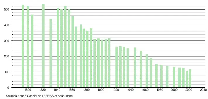 L'évolution du nombre d'habitants est connue à travers les recensements de la population effectués dans la commune depuis 1793. Pour les communes de moins de 10 000 habitants, une enquête de recensement portant sur toute la population est réalisée tous les cinq ans, les populations légales des années intermédiaires étant quant à elles estimées par interpolation ou extrapolation[27]. Pour la commune, le premier recensement exhaustif entrant dans le cadre du nouveau dispositif a été réalisé en 2007[28].