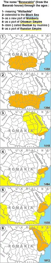 - entre les XVe et XVIIIe siècles, il désignait une région littorale de la mer Noire située au nord des bouches du Danube, acquise par les Bassarab en 1328 et alors rattachée à la Valachie, puis cédée en 1421 à la Moldavie : cette région danubienne et maritime était, jusqu’en 1812, appelée Bessarabie en roumain et sur les cartes européennes et russes, mais dans l’Empire ottoman, qui la conquiert entre 1484 (rives du Danube et de la mer Noire) et 1538 (citadelle et ținut (« comté ») de Tighina), elle est appelée en turc Bucak ;
