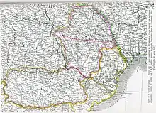 - au XIXe siècle (à partir de 1812), le nom désigne le gouvernement de Bessarabie formé par l’Empire russe avec la Bessarabie-Bucak ottomane et aussi avec toute la moitié orientale de la principauté de Moldavie, lorsqu'il annexa en 1812 ces territoires encadrés entre la rivière Prout à l’ouest, le fleuve Dniestr à l’est, le Danube et la mer Noire au sud : ces limites ont été fixées en 1812 au traité de Bucarest[3] ;