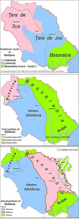La définition et l’étendue de la Bessarabie ont varié selon les périodes successives valaque, moldave, ottomane, russe et royale roumaine[2] :
