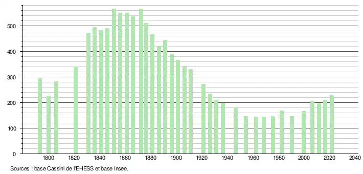 L'évolution du nombre d'habitants est connue à travers les recensements de la population effectués dans la commune depuis 1793. Pour les communes de moins de 10 000 habitants, une enquête de recensement portant sur toute la population est réalisée tous les cinq ans, les populations légales des années intermédiaires étant quant à elles estimées par interpolation ou extrapolation[15]. Pour la commune, le premier recensement exhaustif entrant dans le cadre du nouveau dispositif a été réalisé en 2006[16].