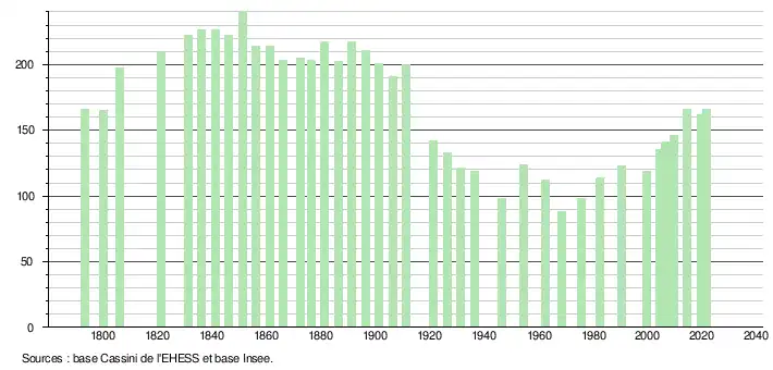 | L'évolution du nombre d'habitants est connue à travers les recensements de la population effectués dans la commune depuis 1793. Pour les communes de moins de 10 000 habitants, une enquête de recensement portant sur toute la population est réalisée tous les cinq ans, les populations légales des années intermédiaires étant quant à elles estimées par interpolation ou extrapolation[44]. Pour la commune, le premier recensement exhaustif entrant dans le cadre du nouveau dispositif a été réalisé en 2004[45]. En 2021, la commune comptait 166 habitants[Note 7], en stagnation par rapport à 2015 (Ariège : +1,38 %, France hors Mayotte : +1,84 %). |