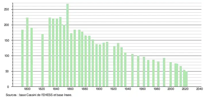 L'évolution du nombre d'habitants est connue à travers les recensements de la population effectués dans la commune depuis 1793. Pour les communes de moins de 10 000 habitants, une enquête de recensement portant sur toute la population est réalisée tous les cinq ans, les populations légales des années intermédiaires étant quant à elles estimées par interpolation ou extrapolation[14]. Pour la commune, le premier recensement exhaustif entrant dans le cadre du nouveau dispositif a été réalisé en 2008[15].