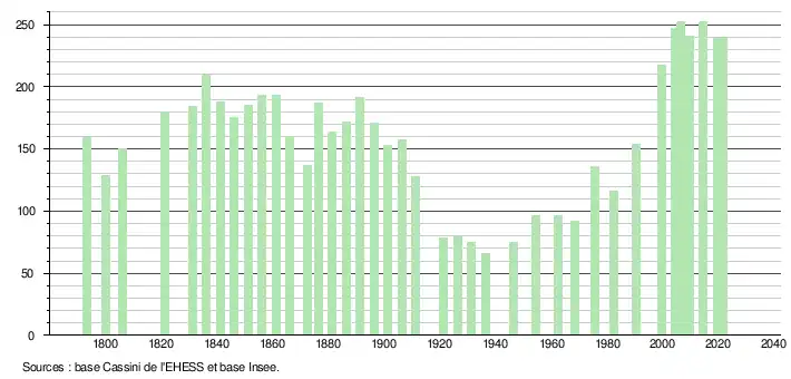 L'évolution du nombre d'habitants est connue à travers les recensements de la population effectués dans la commune depuis 1793. Pour les communes de moins de 10 000 habitants, une enquête de recensement portant sur toute la population est réalisée tous les cinq ans, les populations légales des années intermédiaires étant quant à elles estimées par interpolation ou extrapolation[16]. Pour la commune, le premier recensement exhaustif entrant dans le cadre du nouveau dispositif a été réalisé en 2004[17].