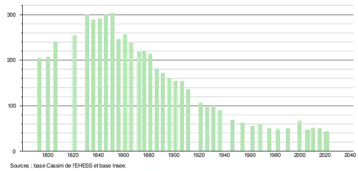 L'évolution du nombre d'habitants est connue à travers les recensements de la population effectués dans la commune depuis 1793. Pour les communes de moins de 10 000 habitants, une enquête de recensement portant sur toute la population est réalisée tous les cinq ans, les populations légales des années intermédiaires étant quant à elles estimées par interpolation ou extrapolation[20]. Pour la commune, le premier recensement exhaustif entrant dans le cadre du nouveau dispositif a été réalisé en 2005[21].