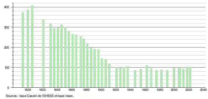 L'évolution du nombre d'habitants est connue à travers les recensements de la population effectués dans la commune depuis 1793. Pour les communes de moins de 10 000 habitants, une enquête de recensement portant sur toute la population est réalisée tous les cinq ans, les populations légales des années intermédiaires étant quant à elles estimées par interpolation ou extrapolation[25]. Pour la commune, le premier recensement exhaustif entrant dans le cadre du nouveau dispositif a été réalisé en 2007[26].