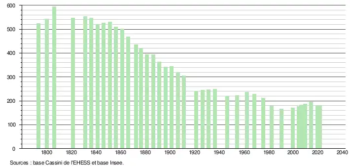 L'évolution du nombre d'habitants est connue à travers les recensements de la population effectués dans la commune depuis 1793. Pour les communes de moins de 10 000 habitants, une enquête de recensement portant sur toute la population est réalisée tous les cinq ans, les populations légales des années intermédiaires étant quant à elles estimées par interpolation ou extrapolation[16]. Pour la commune, le premier recensement exhaustif entrant dans le cadre du nouveau dispositif a été réalisé en 2004[17].
