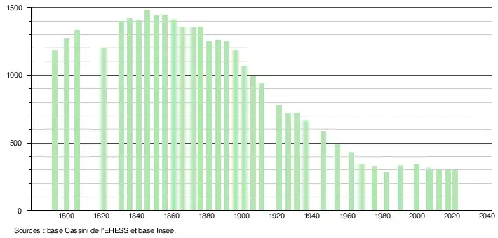 L'évolution du nombre d'habitants est connue à travers les recensements de la population effectués dans la commune depuis 1793. Pour les communes de moins de 10 000 habitants, une enquête de recensement portant sur toute la population est réalisée tous les cinq ans, les populations légales des années intermédiaires étant quant à elles estimées par interpolation ou extrapolation[16]. Pour la commune, le premier recensement exhaustif entrant dans le cadre du nouveau dispositif a été réalisé en 2007[17].