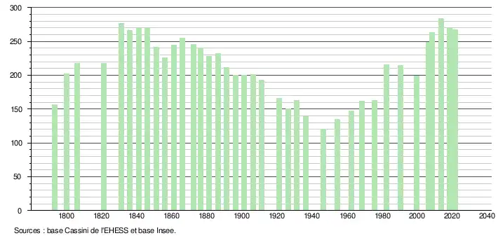 L'évolution du nombre d'habitants est connue à travers les recensements de la population effectués dans la commune depuis 1793. Pour les communes de moins de 10 000 habitants, une enquête de recensement portant sur toute la population est réalisée tous les cinq ans, les populations légales des années intermédiaires étant quant à elles estimées par interpolation ou extrapolation[18]. Pour la commune, le premier recensement exhaustif entrant dans le cadre du nouveau dispositif a été réalisé en 2008[19].