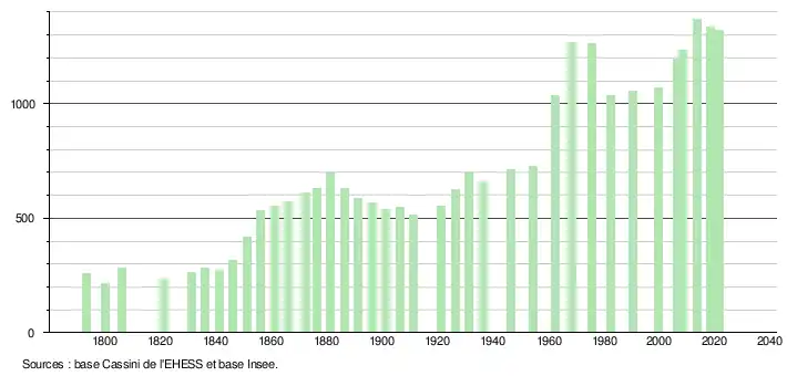 L'évolution du nombre d'habitants est connue à travers les recensements de la population effectués dans la commune depuis 1793. Pour les communes de moins de 10 000 habitants, une enquête de recensement portant sur toute la population est réalisée tous les cinq ans, les populations légales des années intermédiaires étant quant à elles estimées par interpolation ou extrapolation[29]. Pour la commune, le premier recensement exhaustif entrant dans le cadre du nouveau dispositif a été réalisé en 2008[30].