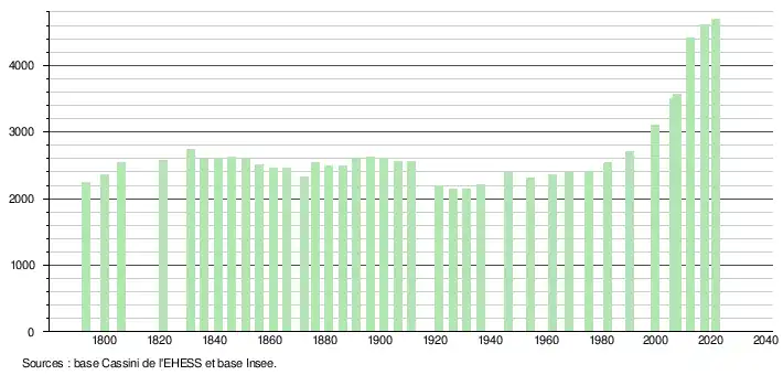 L'évolution du nombre d'habitants est connue à travers les recensements de la population effectués dans la commune depuis 1793. Pour les communes de moins de 10 000 habitants, une enquête de recensement portant sur toute la population est réalisée tous les cinq ans, les populations légales des années intermédiaires étant quant à elles estimées par interpolation ou extrapolation[26]. Pour la commune, le premier recensement exhaustif entrant dans le cadre du nouveau dispositif a été réalisé en 2007[27].
