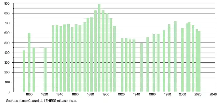 L'évolution du nombre d'habitants est connue à travers les recensements de la population effectués dans la commune depuis 1793. Pour les communes de moins de 10 000 habitants, une enquête de recensement portant sur toute la population est réalisée tous les cinq ans, les populations légales des années intermédiaires étant quant à elles estimées par interpolation ou extrapolation[23]. Pour la commune, le premier recensement exhaustif entrant dans le cadre du nouveau dispositif a été réalisé en 2008[24].