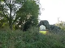 De l'église, qui était une propriété privée[27] jusqu'à ce que la municipalité l’acquière, en 1982, et où, après-guerre, était élevés des lapins, ne subsiste guère que le clocher posé sur la façade occidentale[28]. Le bâtiment présente les restes de quatre époques :