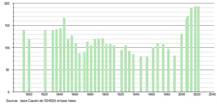 L'évolution du nombre d'habitants est connue à travers les recensements de la population effectués dans la commune depuis 1793. Pour les communes de moins de 10 000 habitants, une enquête de recensement portant sur toute la population est réalisée tous les cinq ans, les populations légales des années intermédiaires étant quant à elles estimées par interpolation ou extrapolation[41]. Pour la commune, le premier recensement exhaustif entrant dans le cadre du nouveau dispositif a été réalisé en 2007[42].