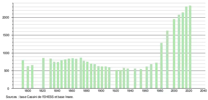 L'évolution du nombre d'habitants est connue à travers les recensements de la population effectués dans la commune depuis 1793. Pour les communes de moins de 10 000 habitants, une enquête de recensement portant sur toute la population est réalisée tous les cinq ans, les populations légales des années intermédiaires étant quant à elles estimées par interpolation ou extrapolation[36]. Pour la commune, le premier recensement exhaustif entrant dans le cadre du nouveau dispositif a été réalisé en 2006[37].