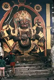 Bhairava ou Kâlabhairava est notamment l'épithète du dieu hindou Shiva sous sa forme terrifiante[3], portant le crâne de Brahma, un autre dieu de la Trimûrti, la trinité hindoue. Shiva avait en effet coupé la cinquième tête de Brahmâ, tête coupable de désir incestueux envers sa fille et femme (née de sa seule pensée), Sarasvatî. Pour se purifier de cet acte sanglant, Shiva fut contraint à errer, fou de remords[réf. nécessaire], comme un mendiant à travers l'univers en tenant la tête de Brahma pendant des années pour expier cette faute.