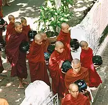 Les moines bouddhistes ne sont pas des mendiants au sens classique du terme car un code de conduite strict régit leur tournée de recueil de nourriture (pindapata) et la façon dont ils reçoivent les dons en général. Ils ne sont pas autorisés à utiliser de l’argent et ne peuvent manger que ce qui est offert ; ils ne peuvent pas faire du bruit, crier ou chanter pour attirer l’attention ; ils marchent silencieusement (dans le cas des moines méditants, ayant présent à l’esprit le sujet de méditation), et acceptent tout ce qui leur est offert comme nourriture, l’important étant l’attitude d’esprit au moment du don ; la nourriture est considérée comme un médicament permettant à la continuité esprit/corps de se maintenir.
