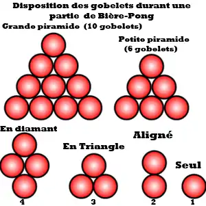 Le jeu est composé de deux équipes de deux joueurs, une de chaque côté de la table, et d'un certain nombre de gobelets mis en place de chaque côté, formant un triangle. Il n'existe pas de règles officielles, et de ce fait il y a de nombreuses façons de jouer, mais habituellement, il y a six ou dix gobelets en plastique disposés en triangle de chaque côté. Le nombre de joueurs par équipe peut ainsi varier de un à trois ou plus.
