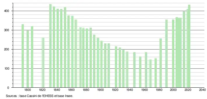 L'évolution du nombre d'habitants est connue à travers les recensements de la population effectués dans la commune depuis 1793. Pour les communes de moins de 10 000 habitants, une enquête de recensement portant sur toute la population est réalisée tous les cinq ans, les populations légales des années intermédiaires étant quant à elles estimées par interpolation ou extrapolation[17]. Pour la commune, le premier recensement exhaustif entrant dans le cadre du nouveau dispositif a été réalisé en 2004[18].