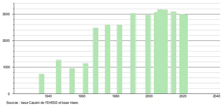 L'évolution du nombre d'habitants est connue à travers les recensements de la population effectués dans la commune depuis 1936. Pour les communes de moins de 10 000 habitants, une enquête de recensement portant sur toute la population est réalisée tous les cinq ans, les populations légales des années intermédiaires étant quant à elles estimées par interpolation ou extrapolation[31]. Pour la commune, le premier recensement exhaustif entrant dans le cadre du nouveau dispositif a été réalisé en 2004[32].