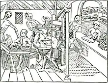 La plus ancienne image connue salle de composition et d'une presse, tirée de la Danse macabre imprimée par Mathias Huss à Lyon en 1499.