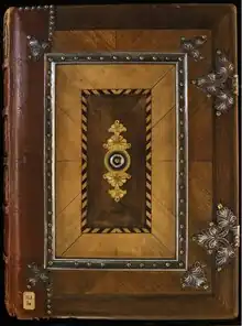 Un des trois volumes de l'exemplaire sur vélin, relié en cuir de porc blanc, conservé à la Bibliothèque du Congrès à Washington depuis 1930. Ex-libris de l'abbaye bénédictine de Saint-Blaise (Forêt-Noire), premier propriétaire.