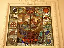 La salle de lecture est placée sous la protection d’Apollon, qui est le dieu grec de la lumière : il est représenté sur la fresque avec sa lyre, et sur les vitres, les couronnes de lauriers (peintes au sulfate de cuivre) sont un de ses attributs, symbole d’excellence.