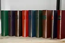9 volumes de la Pléiade montrant les 7 codes couleur par période et les 2 couleurs pour Albums et Hors-série.