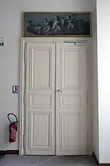 Dessus-de-porte : putti avec un livre et l'abbaye à l'arrière-plan à droite.