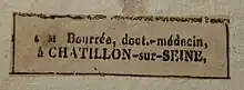 - 1819-1852. Docteur Jean-Baptiste Honoré Bourée (Flavigny 1777- Châtillon 1852)[18], conservateur, correspondant de la Société royale des Antiquaires de France, auteur d'un Mémoire sur les monuments celtiques découverts dans l'arrondissement de Châtillon-sur-Seine (1830)[19], (la Bibliothèque comptait alors 5 000 volumes)[20]. Notice biographique parue dans le Bulletin de la Société des sciences historiques et naturelles de l'Yonne, Auxerre, vol 6, 1851[21]. Il porte la collection à 8 792 volumes[22] consacrant sa rémunération de bibliothécaire aux acquisitions. Il a aussi dirigé le Musée de Châtillon[23]. Un nouveau catalogue est terminé en 1848[3].