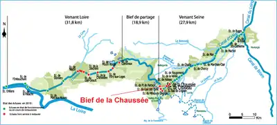 Le bief de la Chaussée s’étend sur une longueur de 1 270 m entre l’écluse Choiseau en amont et l’écluse de la Chaussée en aval[A 10]. Il est entièrement situé sur la commune de Coudroy.