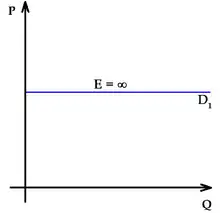 - Quand l'élasticité est nulle, les variations des « grandeurs causes » sont réputées ne pas avoir de conséquences sur les « grandeurs effets ».Concrètement cela signifie que la demande ne varie pas à la hausse ou à la baisse quand le prix varie. La demande reste inchangée quel que soit le prix.C'est notamment le cas des produits de première nécessité : bien que le prix augmente, la consommation se maintient car il existe peu de produits de substitution. À court terme, c'est aussi le cas des « dépenses pré-engagées » : loyers, contrats d'assurance, abonnements[9] de téléphone, télévision, Internet, de fourniture d'eau, d'électricité, etc. De même, lorsque le prix baisse, la demande n'augmente pas nécessairement. L'effet peut être accentué s'il n'existe pas de produit de substitution (exemple : les pâtes remplacées par le riz ou la pomme de terre). Une élasticité nulle à court terme peut toutefois s'avérer non nulle à long terme, car l'augmentation des prix peut pousser à la recherche de nouveaux produits de substitution. Le pétrole, par exemple, est un bien non substituable à court terme mais, sur le long terme, l'augmentation de son prix peut favoriser l'exploitation de nouvelles sources d'énergie et l'achat de voitures consommant moins et/ou des carburants moins chers.