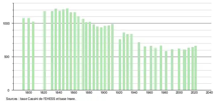 L'évolution du nombre d'habitants est connue à travers les recensements de la population effectués dans la commune depuis 1793. Pour les communes de moins de 10 000 habitants, une enquête de recensement portant sur toute la population est réalisée tous les cinq ans, les populations légales des années intermédiaires étant quant à elles estimées par interpolation ou extrapolation[33]. Pour la commune, le premier recensement exhaustif entrant dans le cadre du nouveau dispositif a été réalisé en 2007[34].