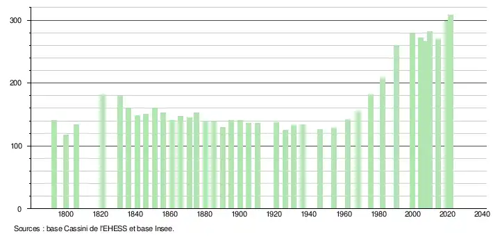 L'évolution du nombre d'habitants est connue à travers les recensements de la population effectués dans la commune depuis 1793. Pour les communes de moins de 10 000 habitants, une enquête de recensement portant sur toute la population est réalisée tous les cinq ans, les populations légales des années intermédiaires étant quant à elles estimées par interpolation ou extrapolation[18]. Pour la commune, le premier recensement exhaustif entrant dans le cadre du nouveau dispositif a été réalisé en 2004[19].