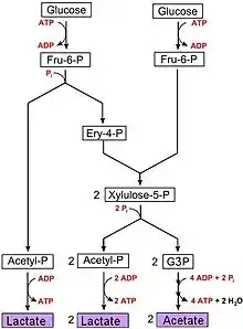 Elle est le siège d'une fermentation hétérolactique, c'est-à-dire la fabrication d'acide lactique associé à de l'acétate, sans dégagement gazeux. On met en évidence la 6-phosphocétolase pour caractériser les bifidobactéries. Cette enzyme permet la transformation directe du glucose en fructose-6-phosphate, ce qui pallie l'absence de la glucose-6-phosphate déshydrogénase. Ces bactéries utiliseront ensuite la voie des pentoses phosphates pour transformer le glucose en lactate et acétate[12].
