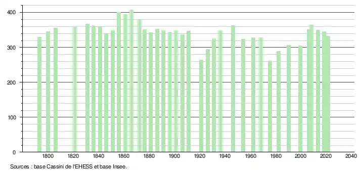 L'évolution du nombre d'habitants est connue à travers les recensements de la population effectués dans la commune depuis 1793. Pour les communes de moins de 10 000 habitants, une enquête de recensement portant sur toute la population est réalisée tous les cinq ans, les populations légales des années intermédiaires étant quant à elles estimées par interpolation ou extrapolation[33]. Pour la commune, le premier recensement exhaustif entrant dans le cadre du nouveau dispositif a été réalisé en 2008[34].